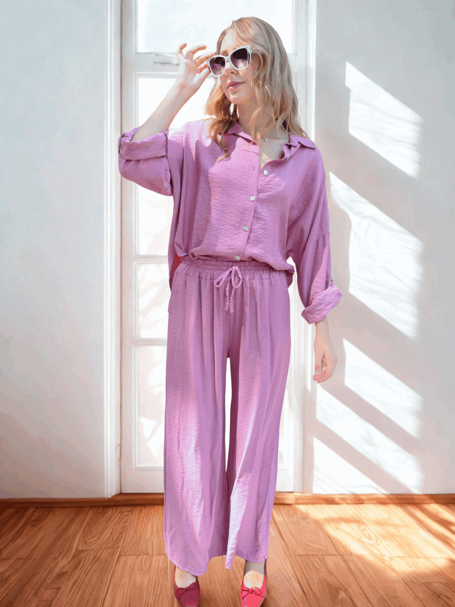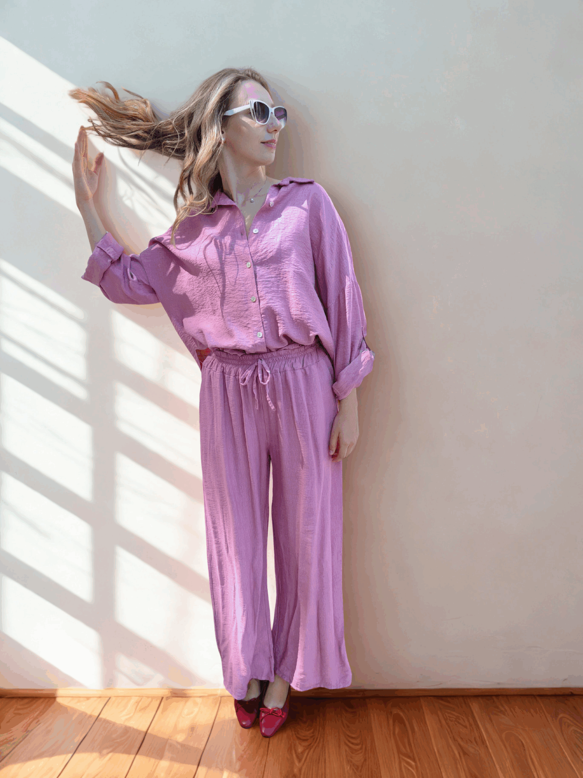Stylowy i funkcjonalny komplet Bergamo w różowym kolorze to doskonały wybór dla kobiet ceniących komfort i elegancję w codziennym wydaniu. Zestaw składa się z długich spodni oraz koszuli z dłuższym rękawem, którą można łatwo dostosować do potrzeb – specjalne zapięcie umożliwia podpięcie rękawa i skrócenie go do długości 3/4. Koszula ma swobodny krój, który pięknie układa się na sylwetce, zapewniając wygodę ruchu. Spodnie o prostym kroju zostały zaprojektowane z myślą o maksymalnej wygodzie – posiadają elastyczny pas i dobrze dopasowują się do ciała, tworząc spójną, elegancką całość z koszulą. Komplet Bergamo to idealne rozwiązanie na spotkania, wyjścia do pracy, a także na co dzień – gdy chcesz wyglądać stylowo, nie rezygnując z komfortu.