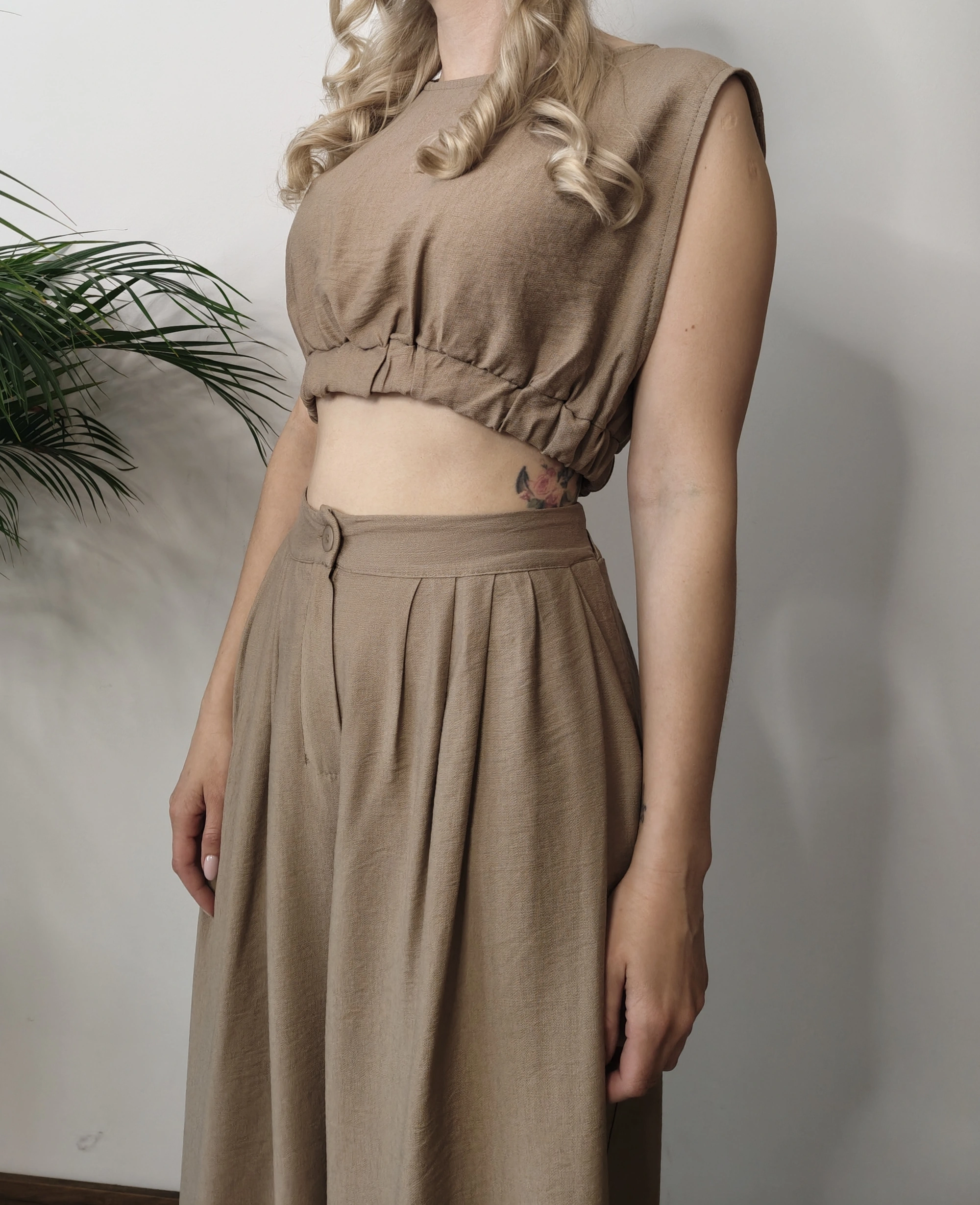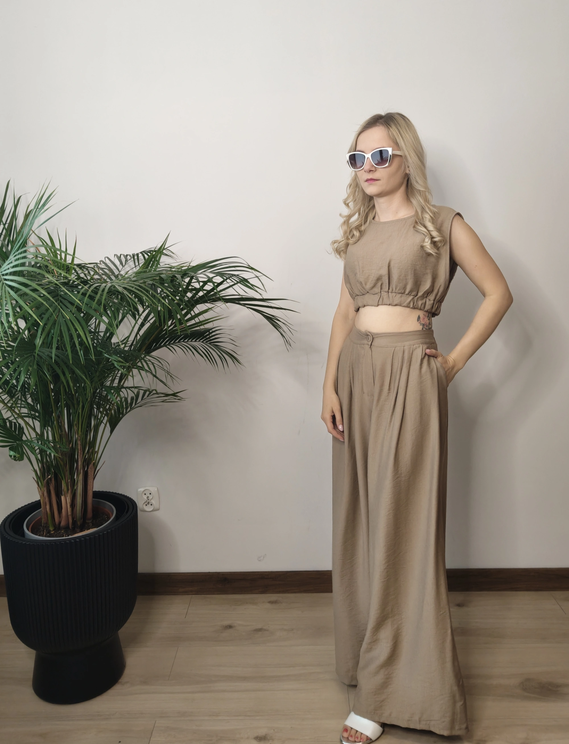 Bluzka ma krótki krój, idealny do letnich stylizacji, natomiast spodnie są wygodne i stylowe – świetnie sprawdzą się zarówno na co dzień, jak i na specjalne okazje.