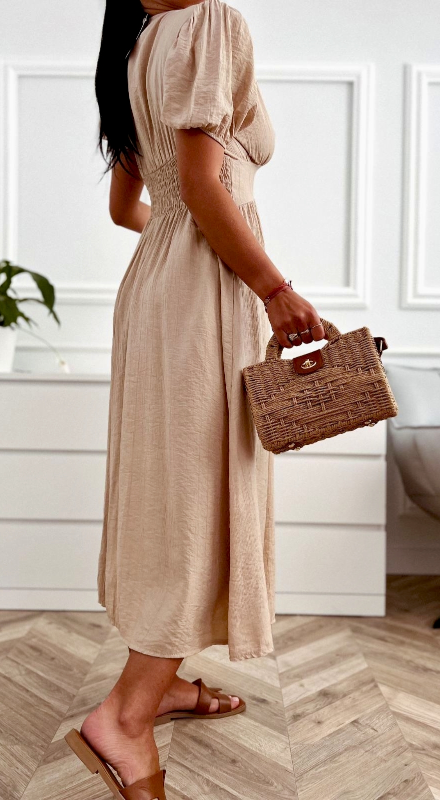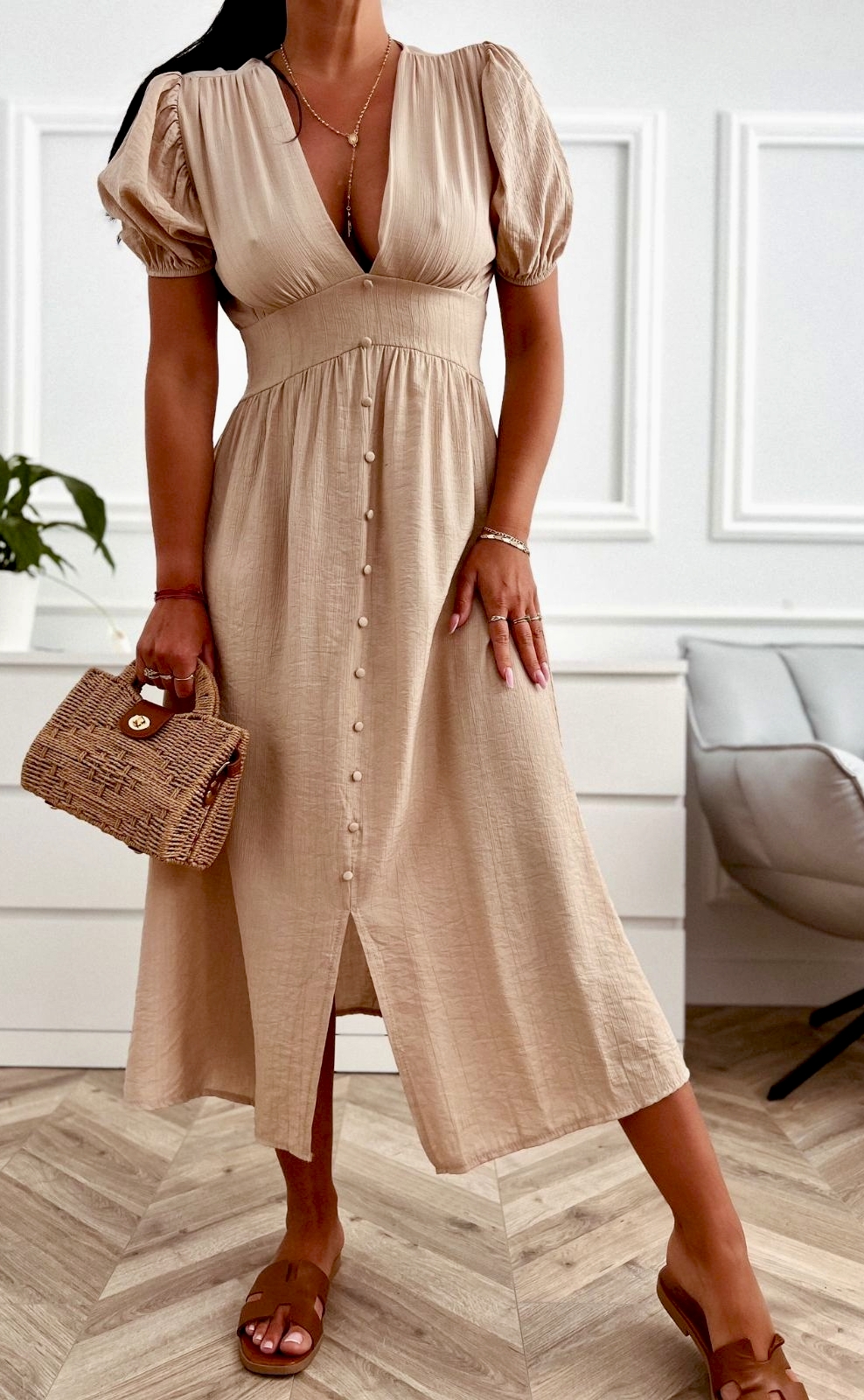 Stylowa i kobieca beżowa sukienka maxi to idealna propozycja na wiele okazji – od letnich spacerów, przez romantyczne kolacje, aż po eleganckie wyjścia. Uszyta z przyjemnego w dotyku materiału, gwarantuje komfort noszenia i doskonałe dopasowanie do sylwetki.